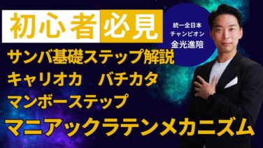 サンバは2/4拍子の陽気でアップテンポな音楽に合わせて踊りますが、最大の特徴は、膝の屈伸を使った「バウンス・アクション(上下の弾み)」、激しいヒップの動き、そしてカーニバルから派生した前進するダイナミックなステップです。フロアを大きく使って前進する華やかなダンスです。
