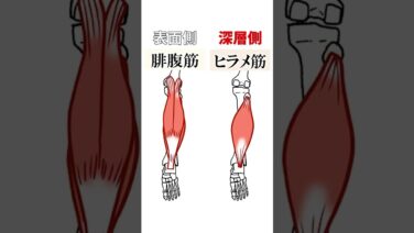 「腓腹筋(ひふくきん)」と「ヒラメ筋」はふくらはぎを構成する筋肉です。「腓腹筋」は膝より上、ヒラメ筋は膝より下からはじまり、アキレス腱に付着しています。